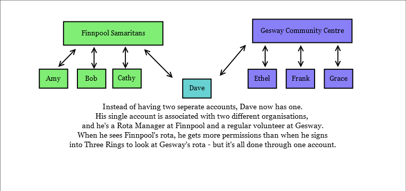 Individual Accounts will allow volunteers like Dave to merge their accounts, so that they only need to remember one username and password. This makes it easier to be a volunteer, because they no longer have to remember multiple usernames and passwords: they only need to remember one. This disassociation between your credentials (your username and password) and your volunteering (at one or more organisations) also paves the way for us to one-day add features to do with handling applicant, trainee, and alumni volunteers – all within Three Rings.